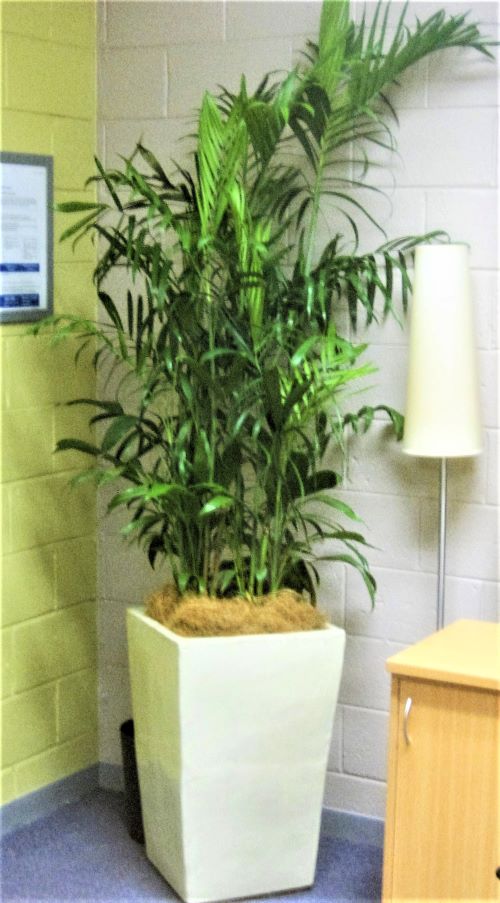 BAMBOO PALM IN LARGE IVORY CERAMIC WEDGE TOPPED WITH COCONUT FIBRE