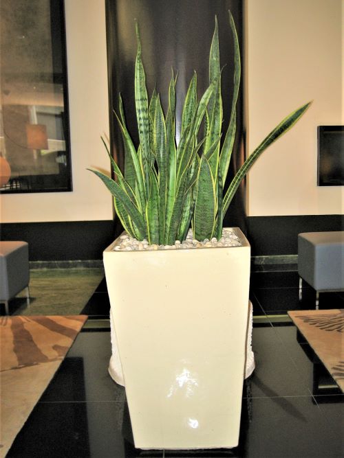 SANSEVIERIA (MOTHER-IN-LAW'S TONGUE) IN LARGE IVORY CERAMIC WEDGE TOPPED WITH WHITE PEBBLES